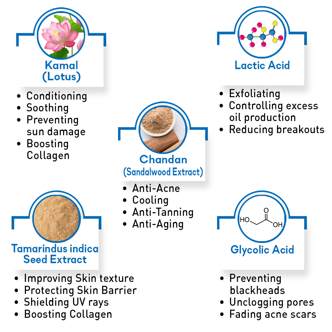 AHAs Lactic Acid, Glycolic acid along with Kamal, Jafran and Tamarind Seed Extract, exfoliates dead skin cells, unclogs pores and smooths uneven texture, revealing fresh, glowing skin.